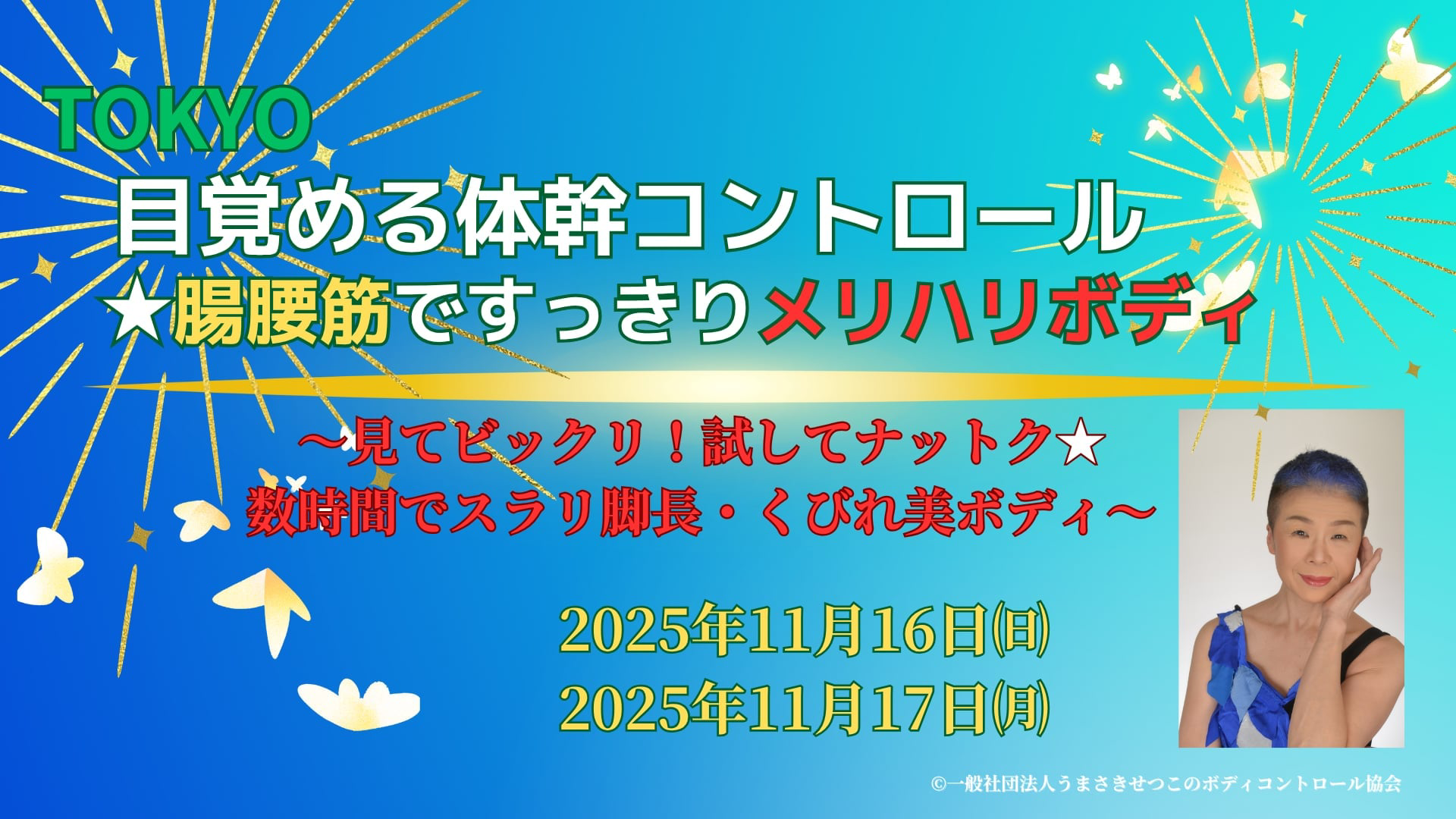 うまさきせつこのボディコントロールⓇをリアルに体験し効果を実感できる、東京ワークショップを11月16日(日)、17日(月)東京にて開催いたします。2025年内のリアルイベントの開催はこちらが最終です。